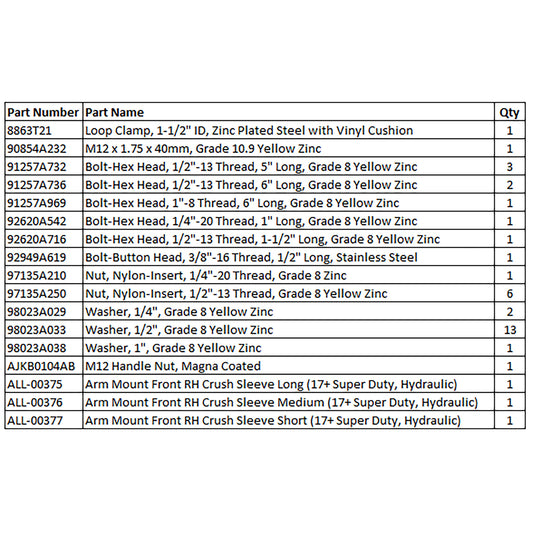 Arm Mount Front RH Hardware Kit (08-16 Super Duty, Hydaulic)Regular price $32.63 USDRegular priceUnit price per-