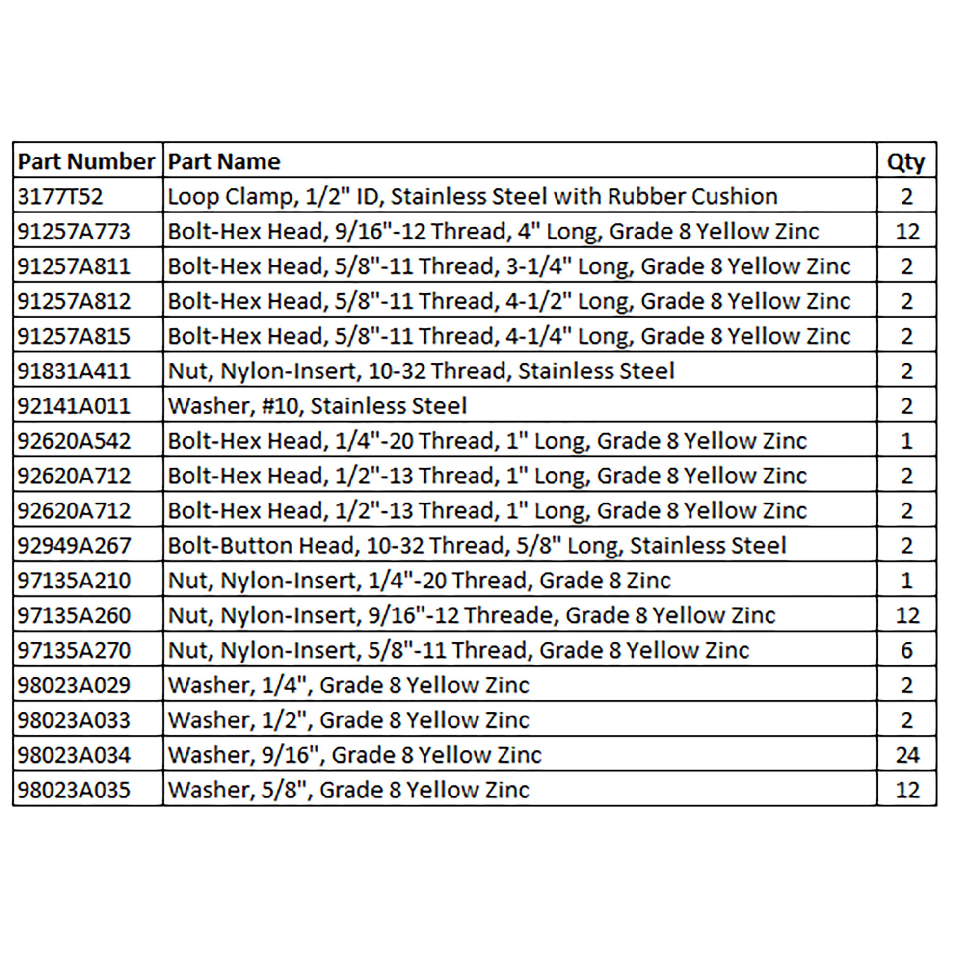 Kit Contents: Refer to the second picture for a detailed parts list of kit components and quantities. The parts list displays the corresponding part numbers from www.mcmaster.com if you need detailed information on each component included in the kit.