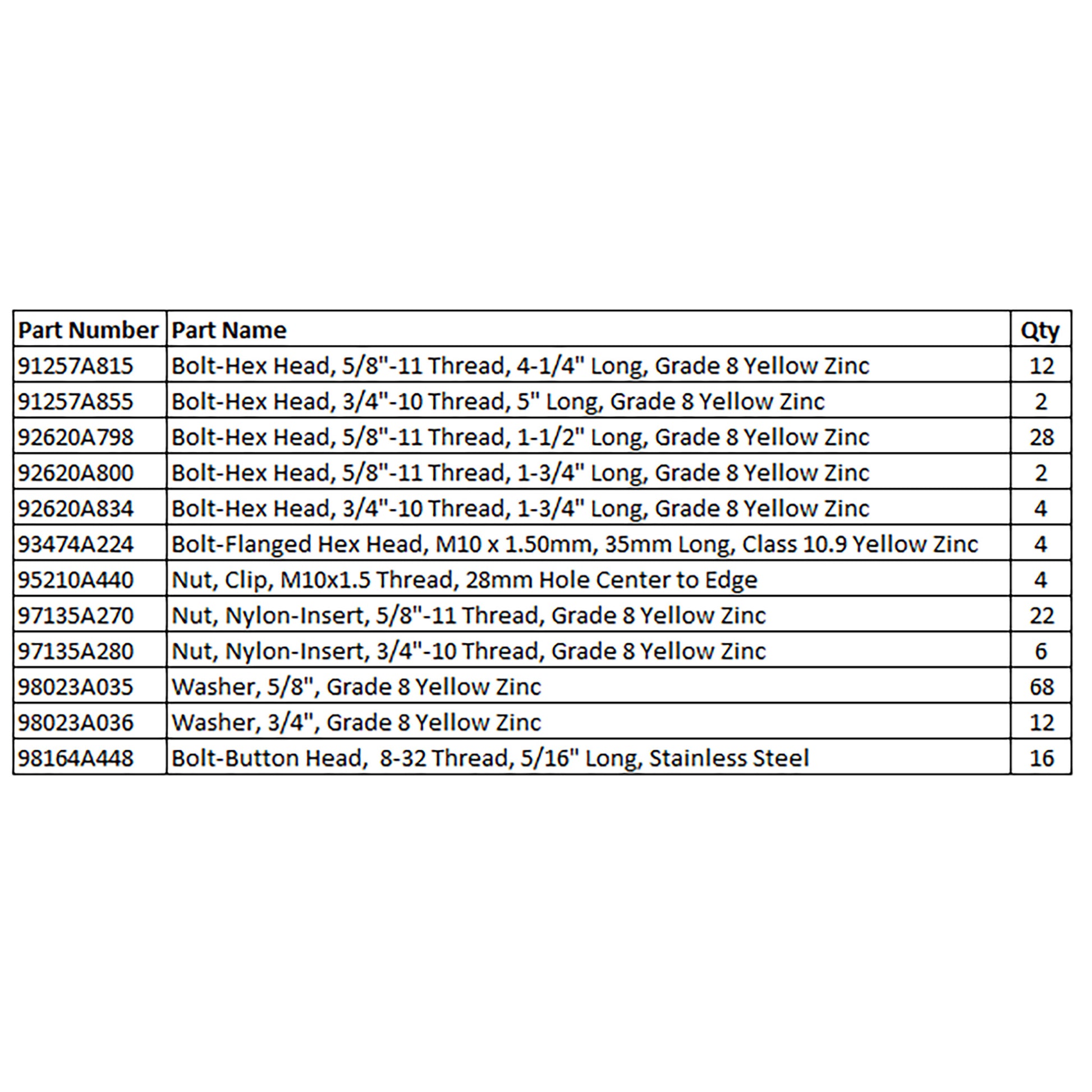 Kit Contents: Refer to the second picture for a detailed parts list of kit components and quantities. The parts list displays the corresponding part numbers from www.mcmaster.com if you need detailed information on each component included in the kit.
