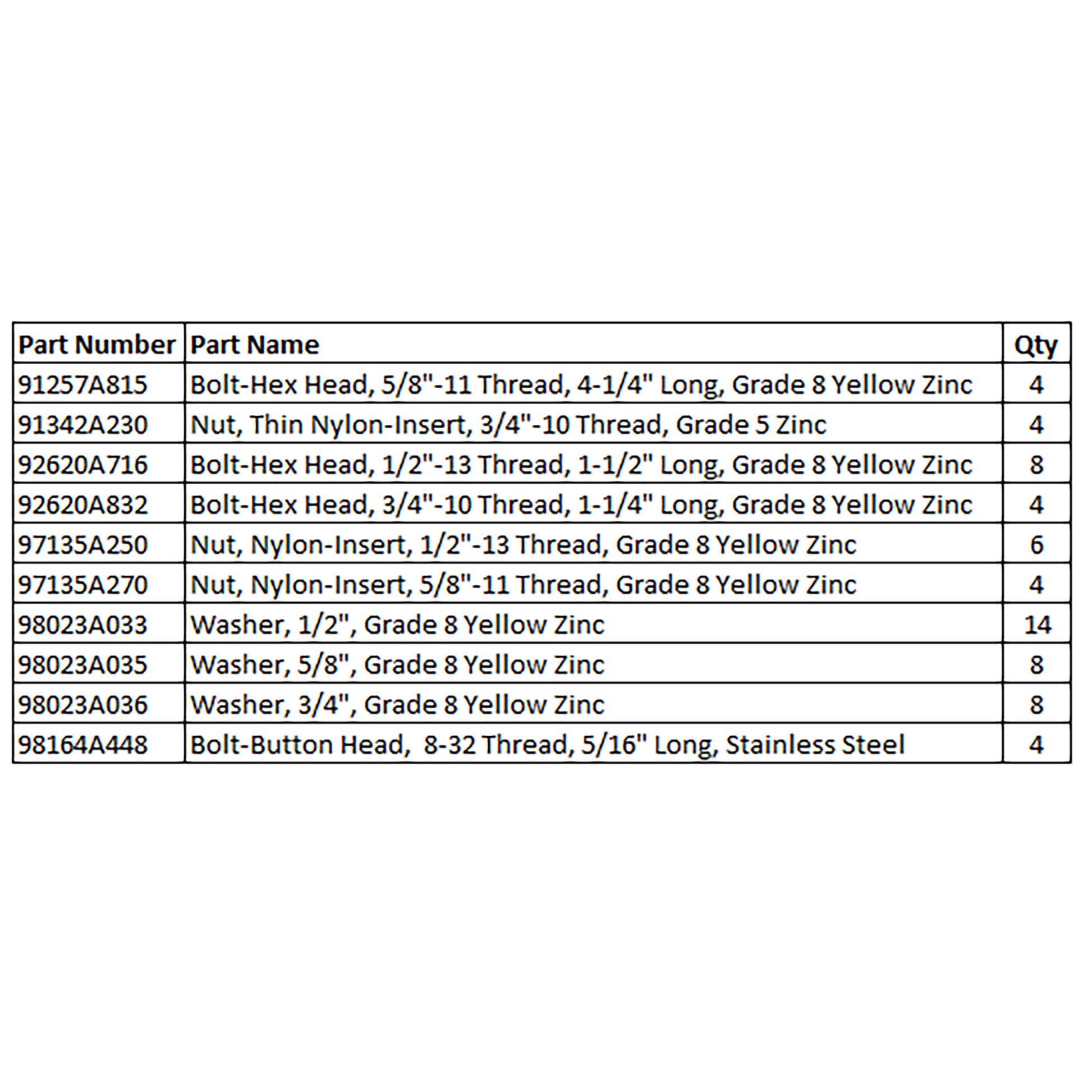 Description: This kit includes all necessary hardware to securely attach the front crossmember to the frame, the 4Link to the front crossmember, and the logos to the front crossmember.