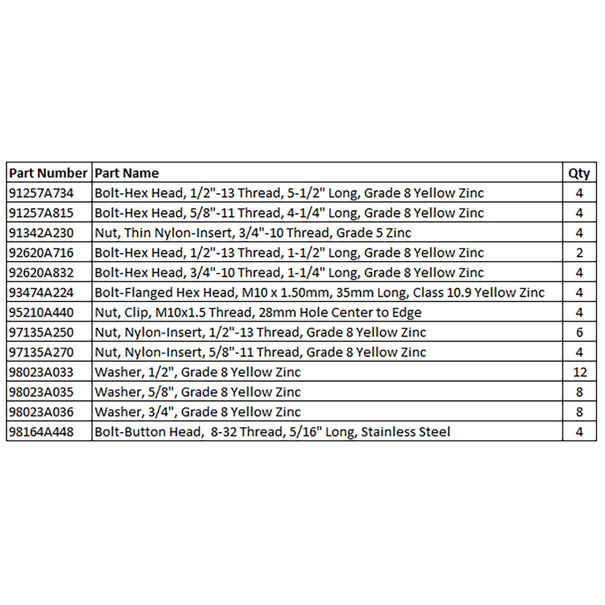 Kit Contents: Refer to the second picture for a detailed parts list of kit components and quantities. The parts list displays the corresponding part numbers from www.mcmaster.com if you need detailed information on each component included in the kit.