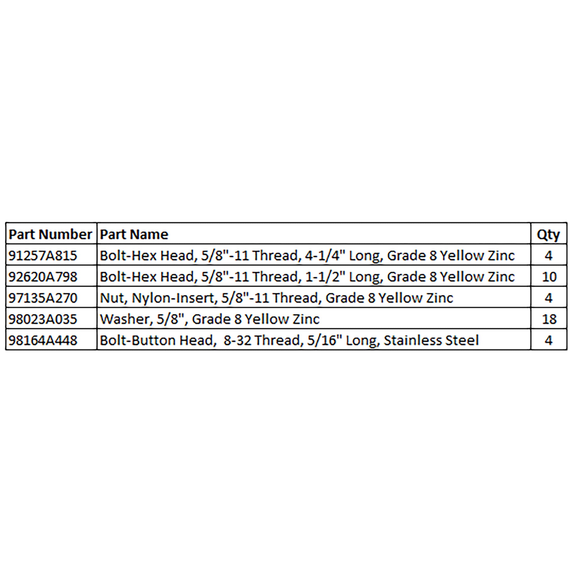 Kit Contents: Refer to the second picture for a detailed parts list of kit components and quantities. The parts list displays the corresponding part numbers from www.mcmaster.com if you need detailed information on each component included in the kit.