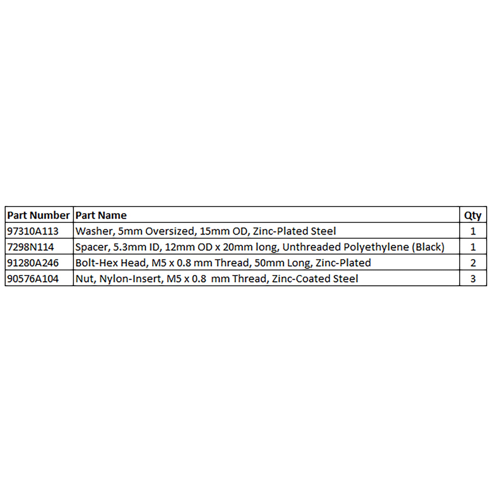 Kit Contents: Refer to the second picture for a detailed parts list of kit components and quantities. The parts list displays the corresponding part numbers from www.mcmaster.com if you need detailed information on each component included in the kit.