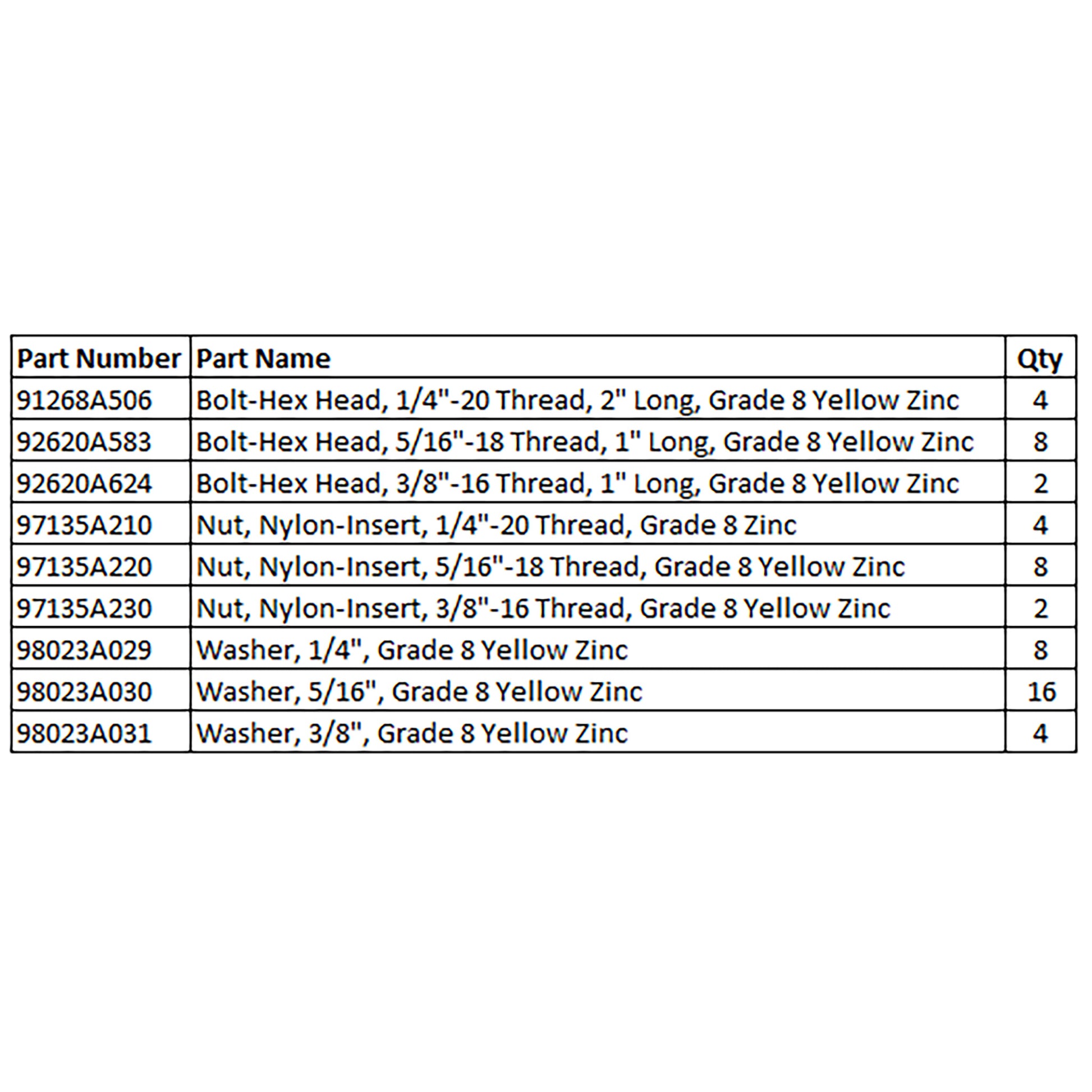 Kit Contents: Refer to the second picture for a detailed parts list of kit components and quantities. The parts list displays the corresponding part numbers from www.mcmaster.com if you need detailed information on each component included in the kit.