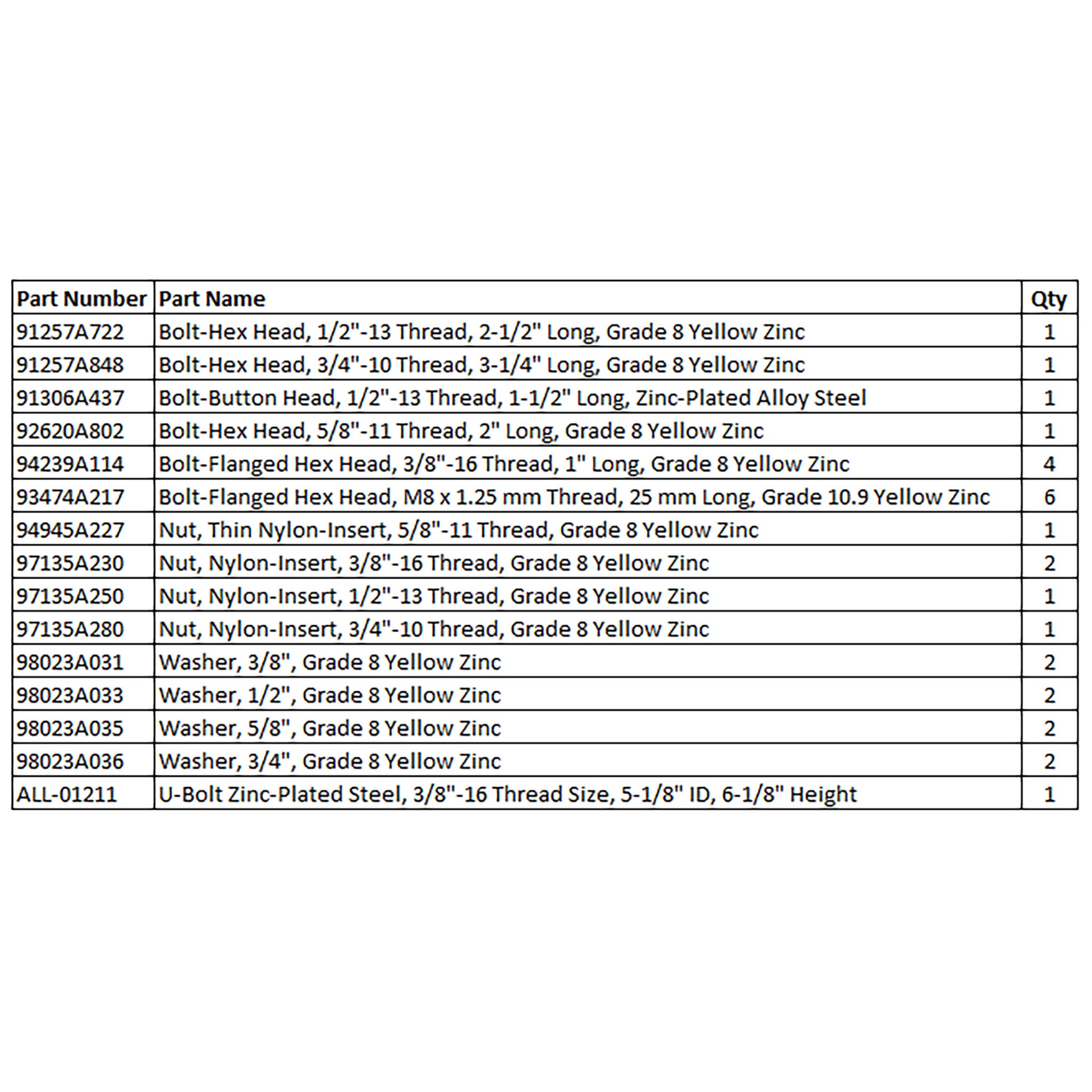 Kit Contents: Refer to the second picture for a detailed parts list of kit components and quantities. The parts list displays the corresponding part numbers from www.mcmaster.com if you need detailed information on each component included in the kit.