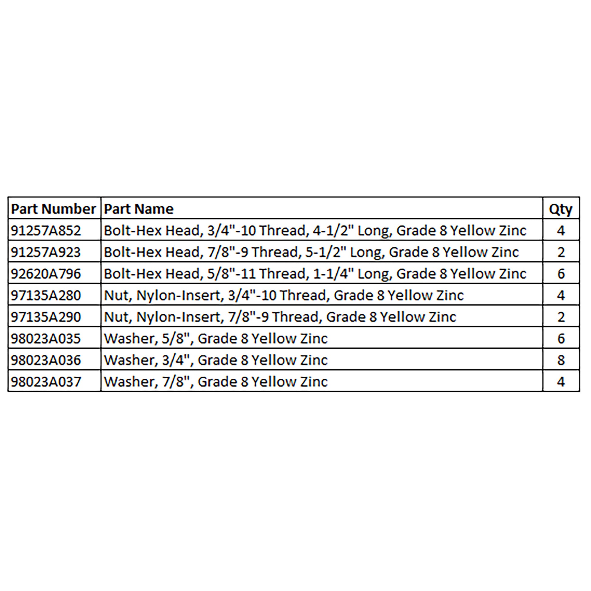 Kit Contents: Refer to the second picture for a detailed parts list of kit components and quantities. The parts list displays the corresponding part numbers from www.mcmaster.com if you need detailed information on each component included in the kit.