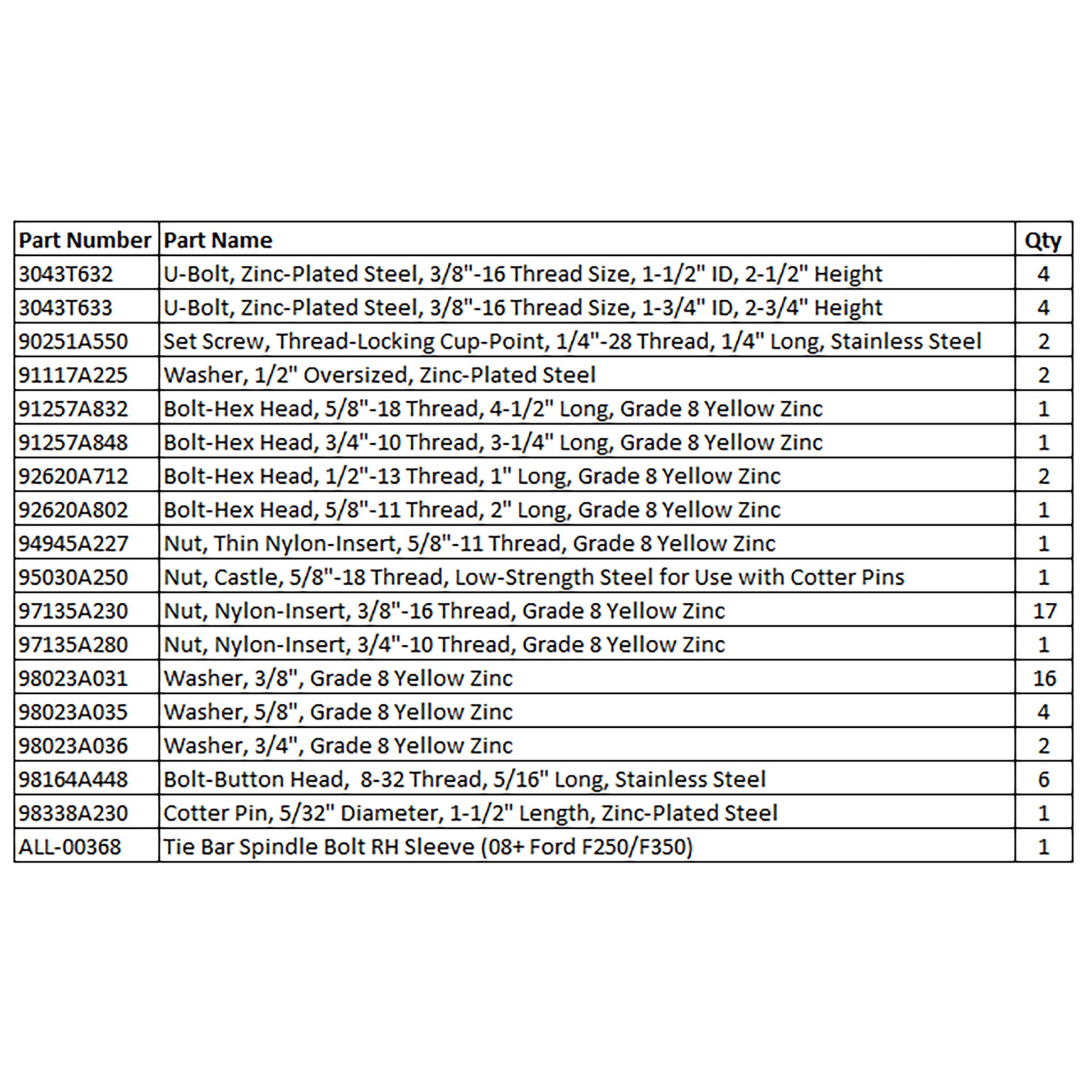 Description: This kit includes all necessary hardware to attach the Tie Bar Mount to the factory tie bar, the Steering Short Link to the Tie Bar Mount, and the Accent Plates to the Tie Bar Mount.