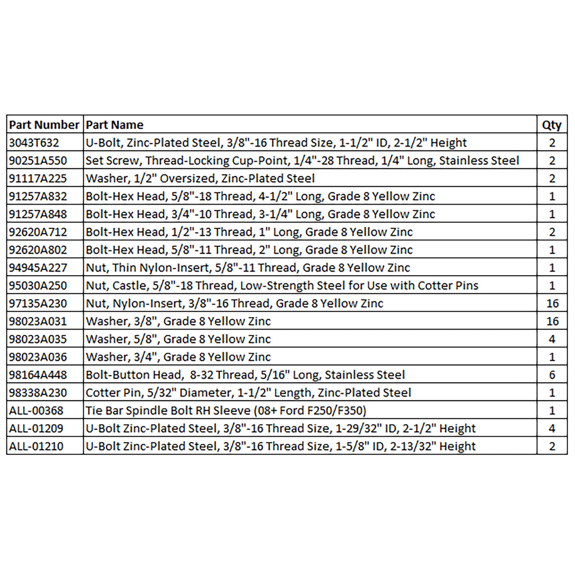 Description: This kit includes all necessary hardware to attach the Tie Bar Mount to the factory tie bar, the Steering Short Link to the Tie Bar Mount, and the Accent Plates to the Tie Bar Mount.